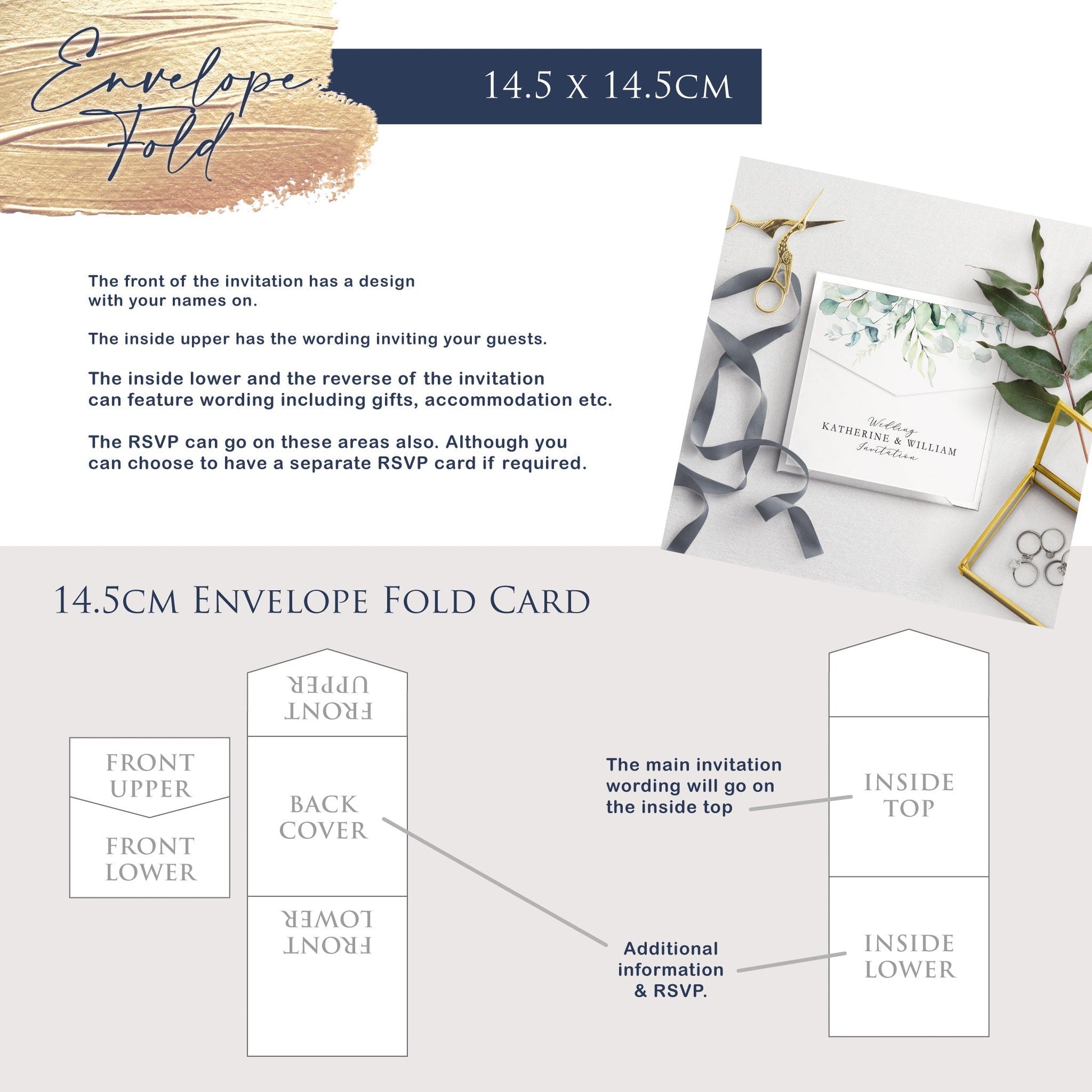 This invitation when closed is 14.5cm squared, and it includes an outer envelope. This luxe invitation features an envelope shaped flap. Ideal for Day Invitations that need to hold a medium amount of wedding invitation.