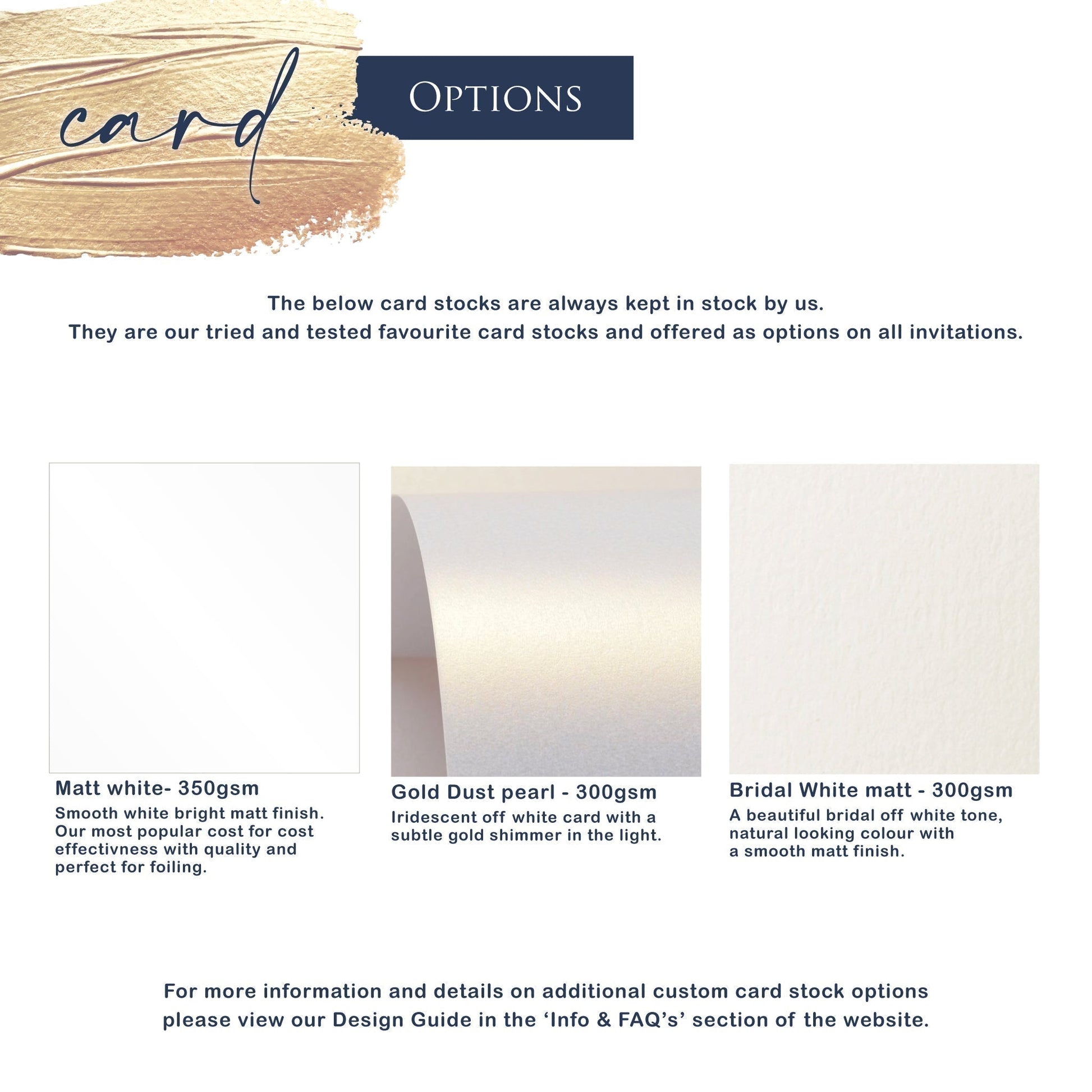 If you require more space for any other information then we recommend choosing our Concertina invitation that holds a large amount of wedding information. Alternatively you can choose to include a separate information card that will be printed front and back.