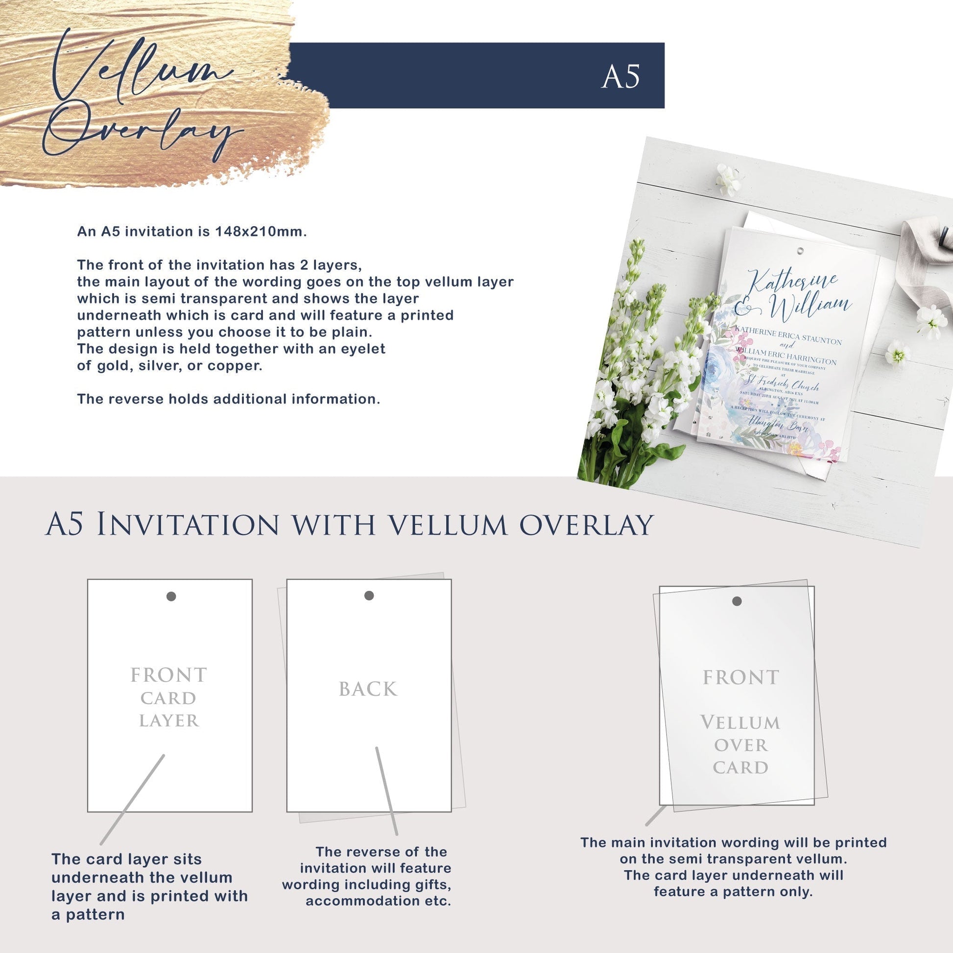 This invitation is an A5 single sheet invitation sized 14.8x21cm with a semi transparent vellum cover sheet attached with a metal eyelet. The main invitation wording is printed on the semi transparent vellum and the card underneath can be plain or feature a pattern.