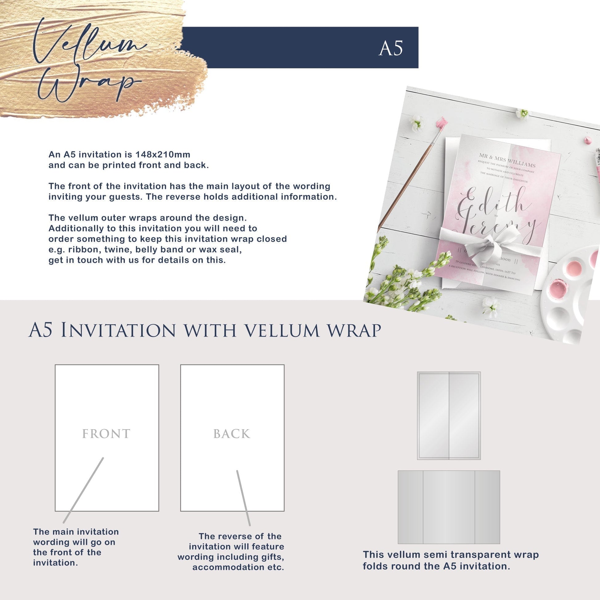 This invitation is an A5 single sheet invitation sized 14.8x21cm printed front and back with your invitation information. Around it wraps a semi transparent vellum wrap.